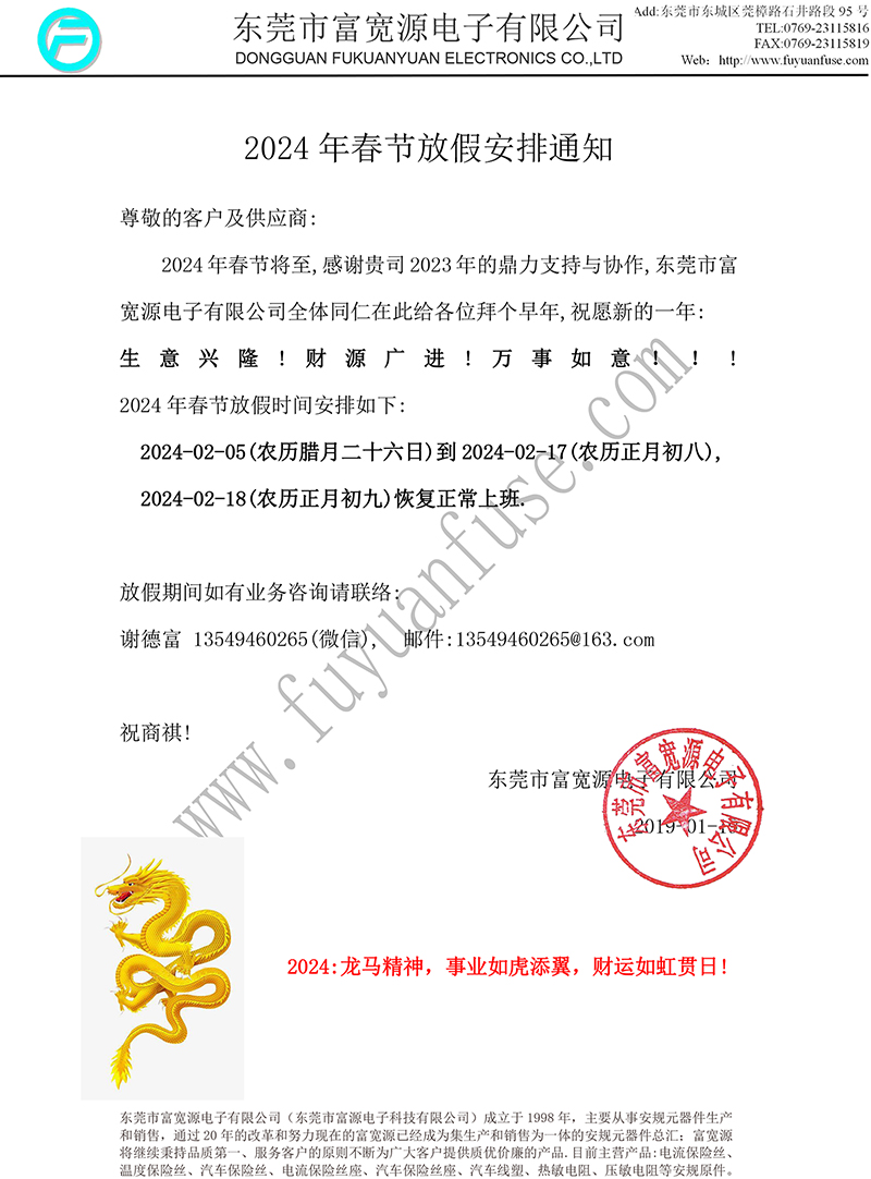 2024年春節(jié)將至,感謝貴司2023年的鼎力支持與協(xié)作,東莞市富寬源電子有限公司全體同仁在此給各位拜個(gè)早年,祝愿新的一年: