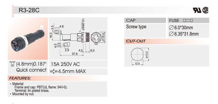 6*30 面板安裝保險絲座 R3-28C UL CSA 15A250V