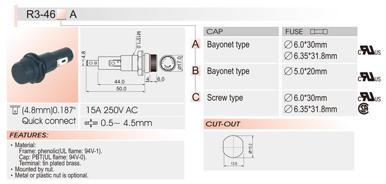 5*20/6*30面板安裝保險絲座 R3-46 UL CSA 15A250V