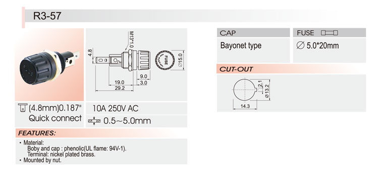 5*20面板安裝保險(xiǎn)絲座 R3-57 UL CSA 10A250V