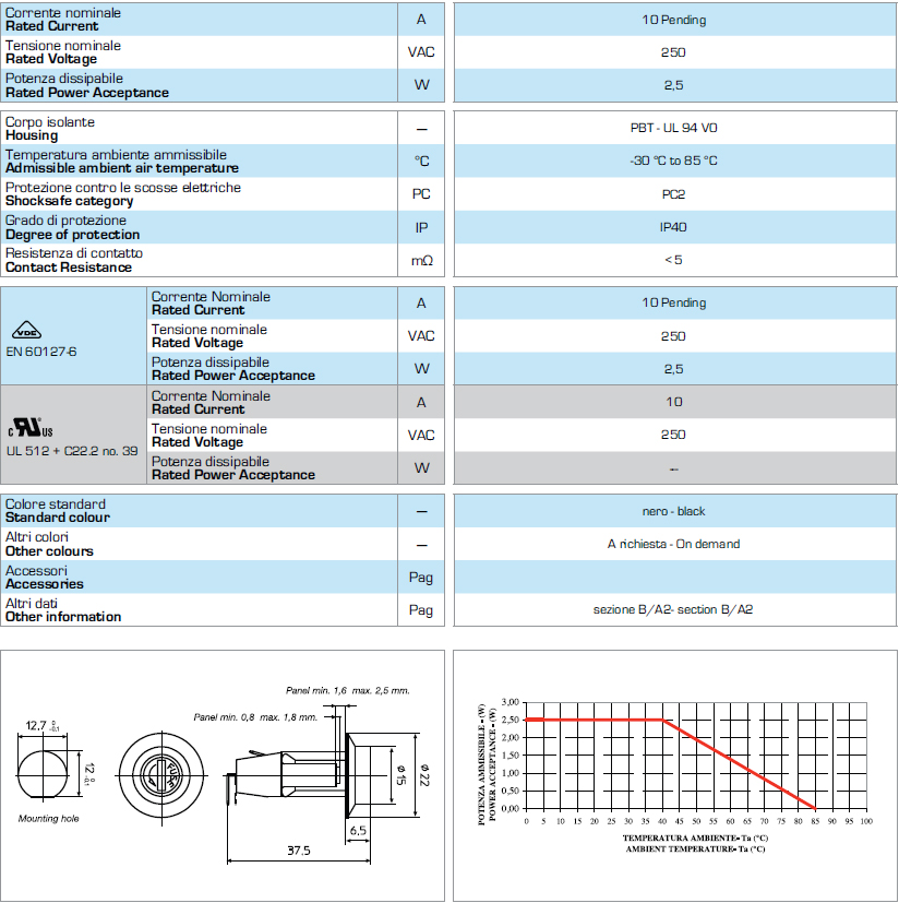 5*20 面板安裝保險絲座 PTF-40 S VDE UR CSA 10A250V