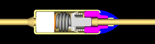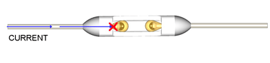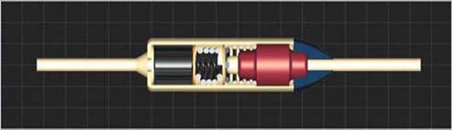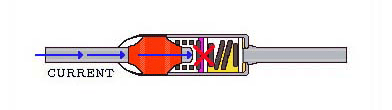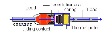 -SW-1.3.5 系列溫度保險絲由可動觸點(sliding contact)、 彈簧(spring)、可熔體(electrically nonconductive thermal pellet)構(gòu)成。在溫度保險絲啟動之前電流從左側(cè)引線流向可動觸點(sliding contact),通過金屬外殼向右側(cè)引線流動。在外部溫度達(dá)到預(yù)定溫度時可熔體熔化,壓縮彈簧會變松。即彈簧膨脹,可動觸點(slidingcontact)與左側(cè)引線分離?;芈繁淮蜷_,可動觸點(sliding contact)與左側(cè)引線間電流被切斷。