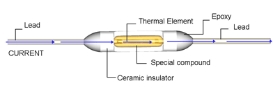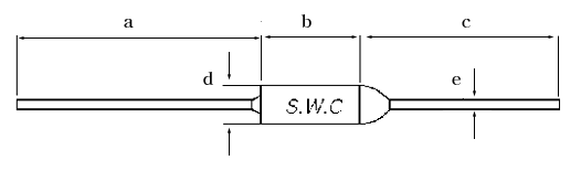 -SW-2 系列溫度保險絲由軸對稱的引線(leed )、在規(guī)定溫度下可熔化的金屬化合物可熔體(thermal element)及為防止其熔化氧化的特殊混合物(special compound)和絕緣容器(ceramic insulator)構(gòu)成。周圍溫度上升時特定的樹脂混合物開始液化, 當(dāng)達(dá)到熔點時樹脂混合物熔化產(chǎn)生表面張力作用,之后連接兩個引線的金屬化合物熔化移向引線,從而永久切斷回路。
